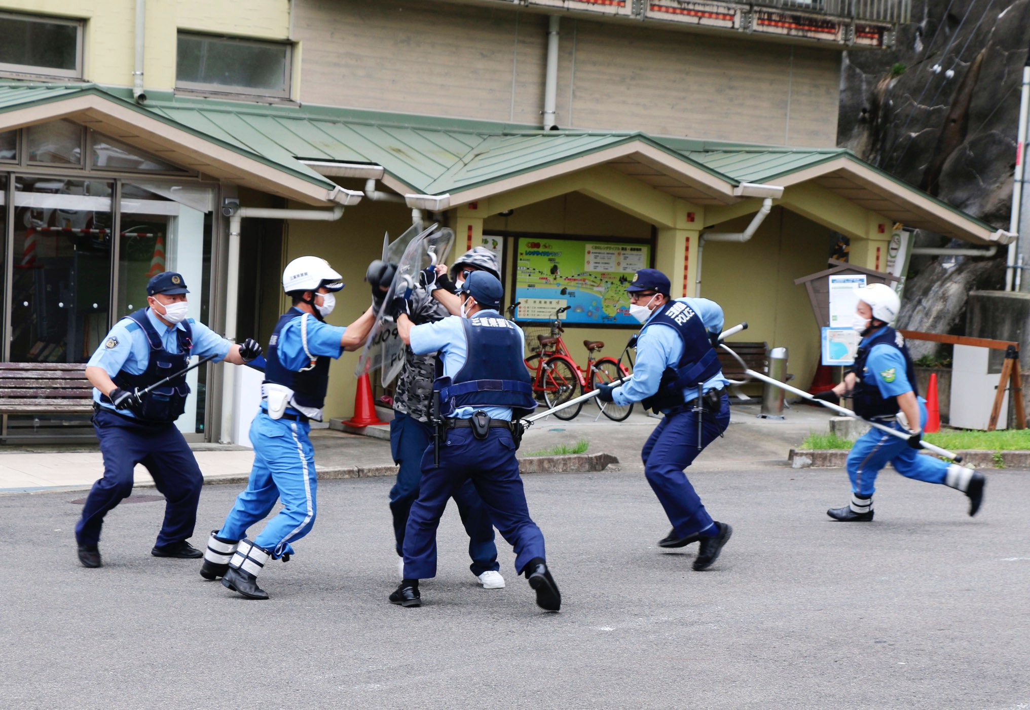 熊野署(奥山幸伸署長)、紀宝署(森阪剛士署長)、尾鷲署(植松重光署長)、県警高速道路交通警察隊と三重交通株式会社南紀営業所(中川康司所長)によるテロ対策合同訓練が6日、熊野市木本町の鬼ヶ城センターで開かれた。