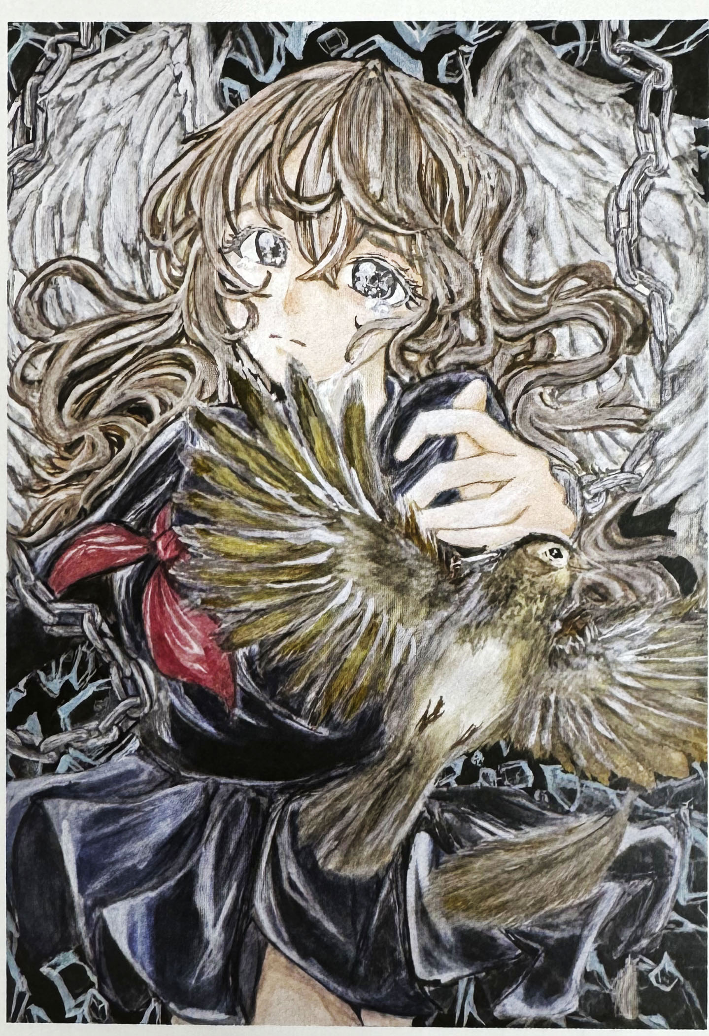 野さんは『いまさら翼といわれても』(米澤穂信著)を絵で表現。最優秀賞の知らせに「進路に悩んでいる女の子の心境が私とそっくりで、その気持ちを表したいと描きました。今まで自分の絵が高く評価されたことがなかったので、人生で貴重な経験になりました。やったんだという気持ち」と喜んだ。