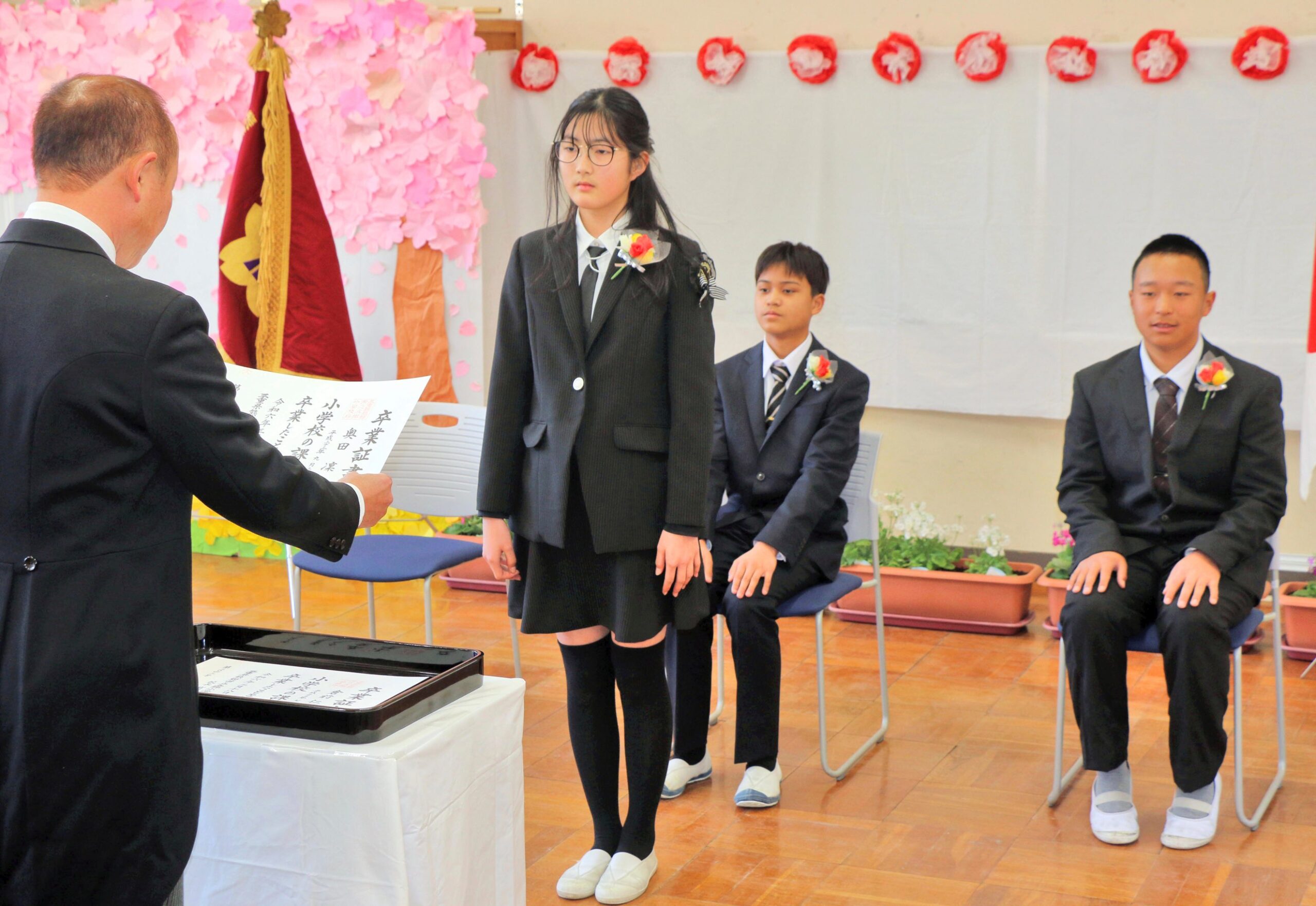 熊野市五郷小学校(濱野修二校長)は18日に卒業式を挙行。在校生や教員、保護者の拍手に迎えられ卒業生が入場した。国歌、校歌斉唱に続き濱野校長が卒業生の奥田凜、倉前仁朗、森岡峻徳さんに卒業証書を授与した。