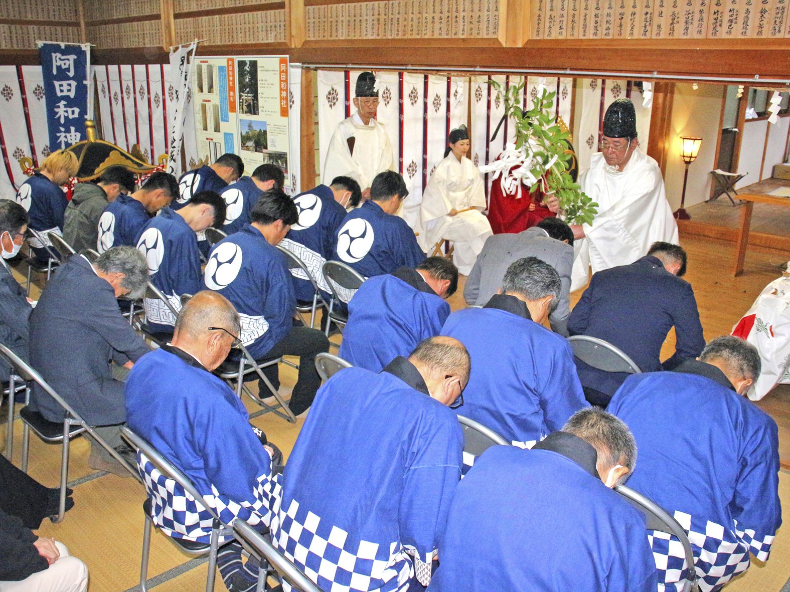 最初に行われた慰霊祭には遺族会や総代らが参列し、先の大戦で犠牲になった英霊を追悼。続く神事では、拝殿内に神饌(しんせん)が供えられると、宮地秀直宮司が地域の平安や商工業の振興や豊漁を願って祝詞(のりと)を捧げた。その後、舞姫で阿田和小学校6年の下川愛空さん、5年の森倉舞さんが浦安の舞を奉納。稽古を重ね、本番で見事に役目を果たした。神事後は拝殿内で交流会が獅子舞の演目のひとつ『花がかり』を披露した。