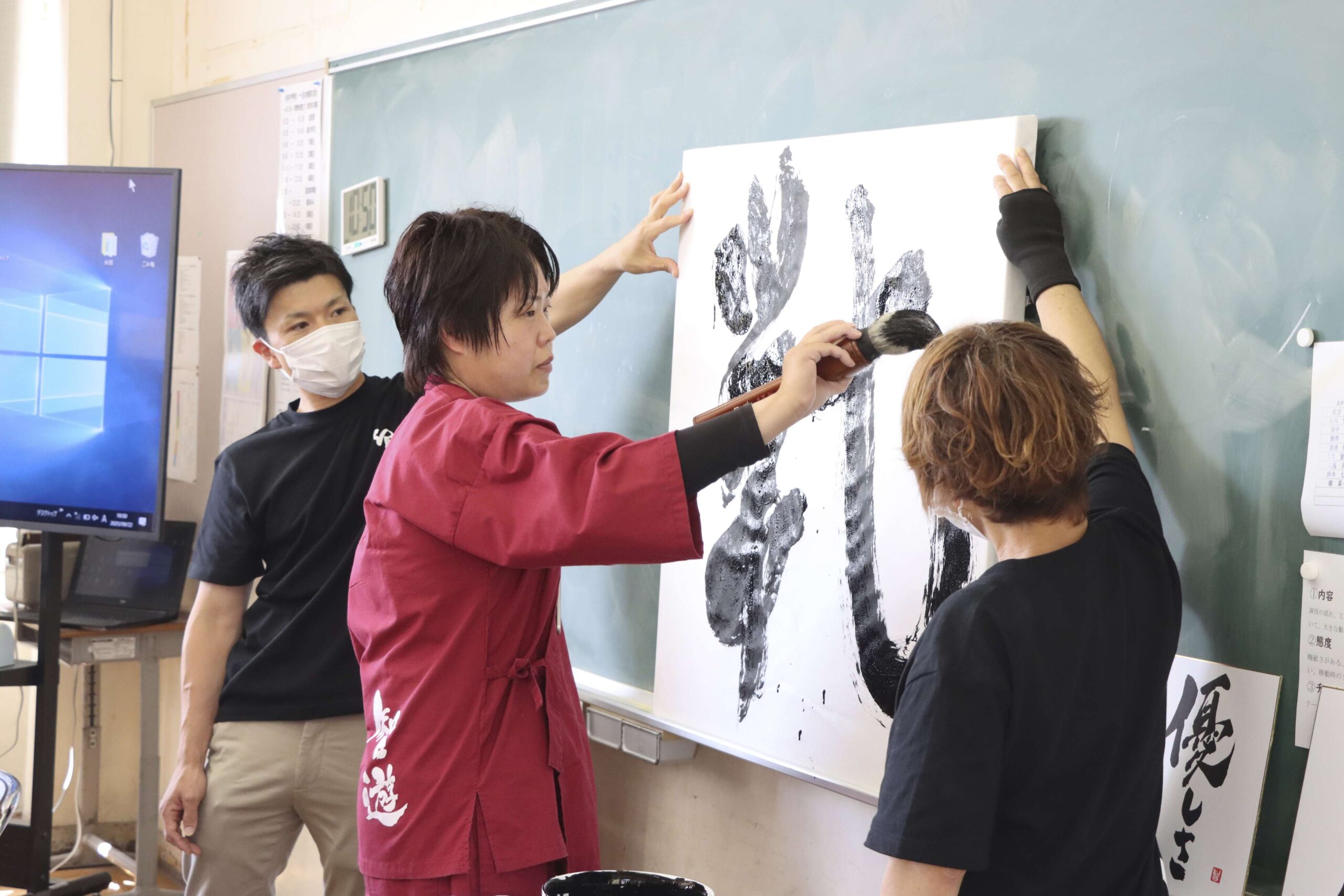 この後、生徒たちはグループに分かれ「自分が困っている時、何をしてもらったら嬉しいか」などを話し合った。自分たちで実際に筆を手に「挑戦」「尊敬」「夢」「努力」「十人十色」などの言葉を半紙に記し、前に進む挑戦心を養った。