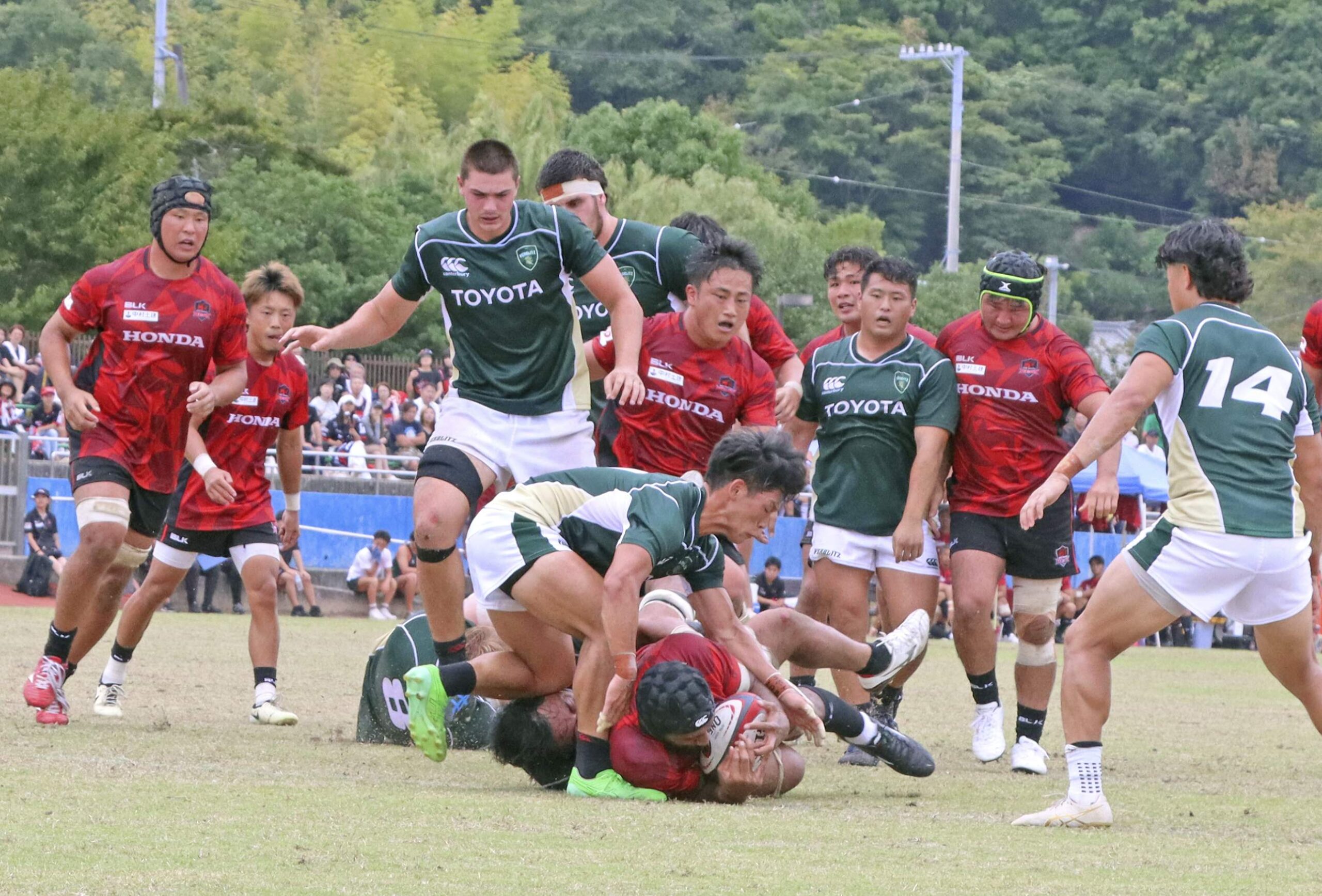 第30回熊野市ラグビーフットボールフェスティバルと「ジャパンラグビー・リーグワン・ライジング2025」公式戦の三重ホンダヒート対トヨタヴェルブリッツが28日、熊野市有馬町の山崎運動公園で開かれた。会場には多くのラグビーファンが訪れ、最高峰のプレーを満喫した。