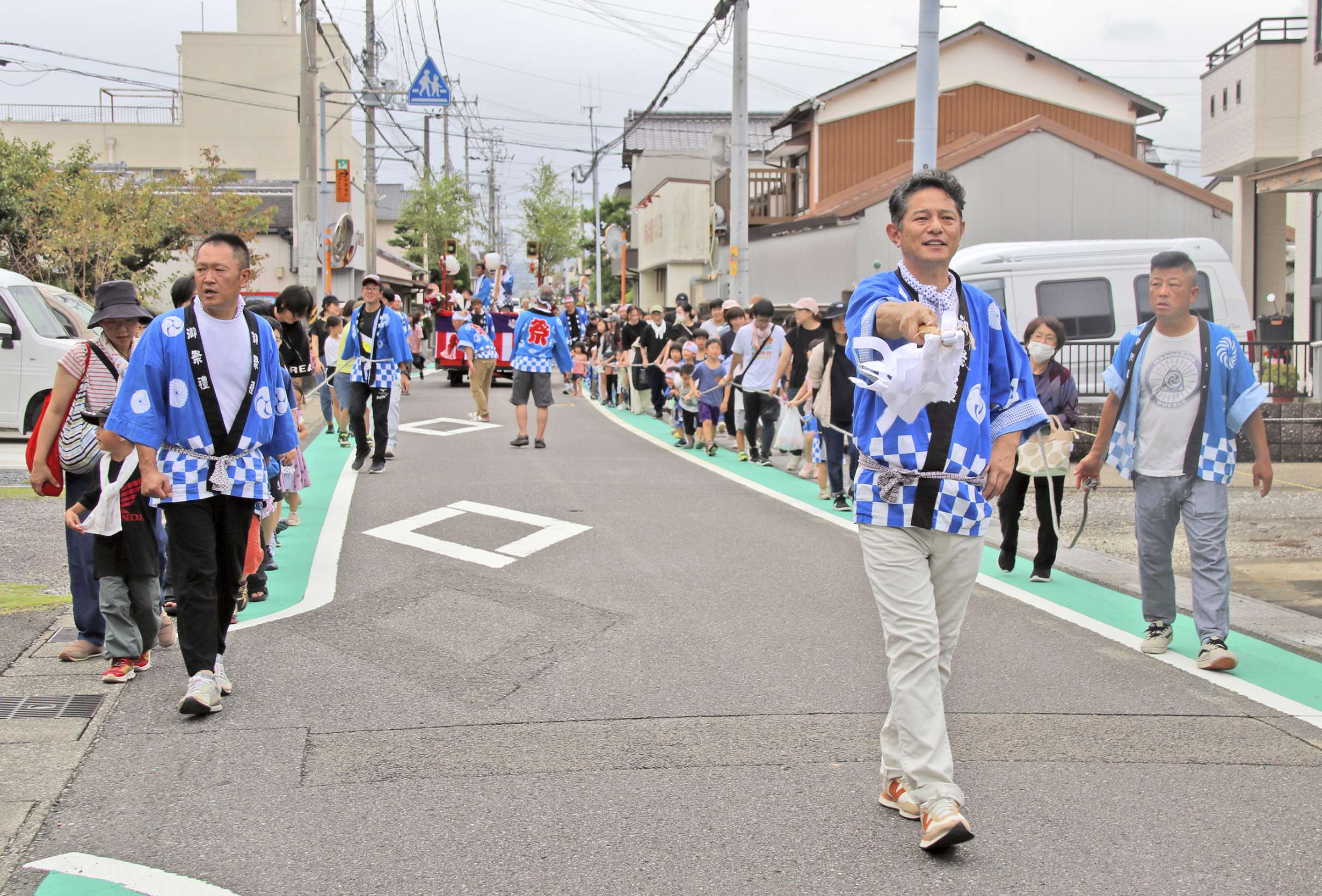 心配された雨も上がり、ハッピ姿の園児をはじめ、実行委員や地域住民ら大勢が参加した。山川均花の窟神社宮司による神事に続いて、行列が立石地区を出発。子どもたちが元気よく花車を引いた。