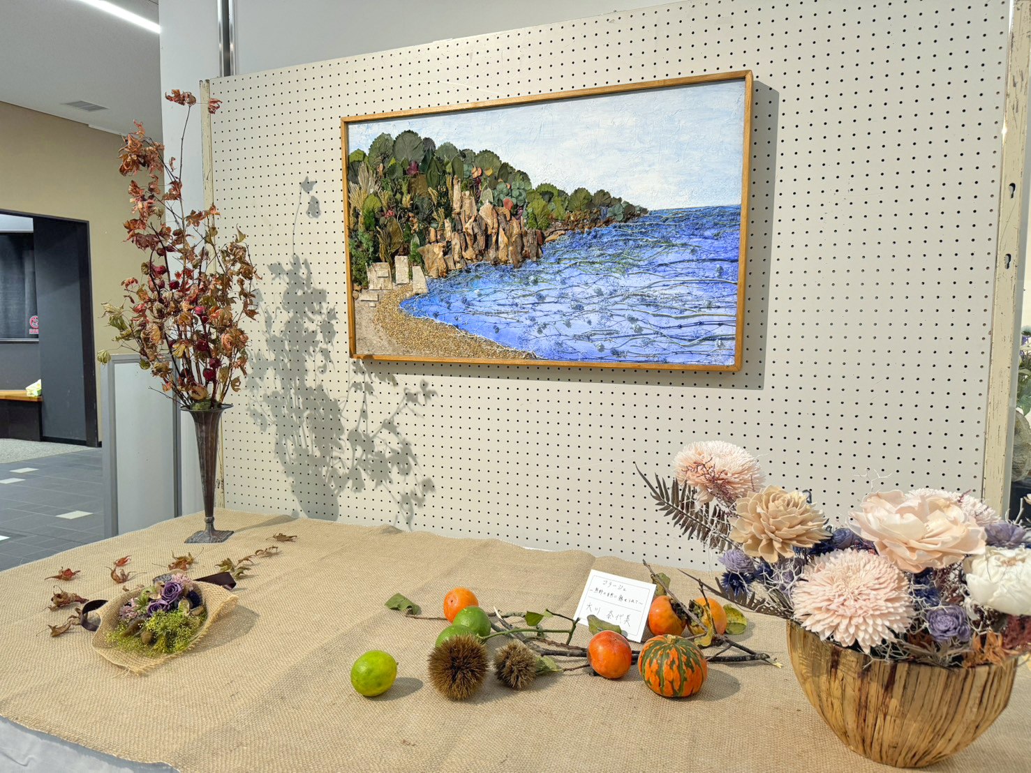 「絵手紙くまの」は昭和の思い出を温かみあるイラストと言葉で表現。フラワーデザインの作品では今回始めて植物素材を絵画的にアレンジした「フローラルコラージュ」の作品が出品された。
