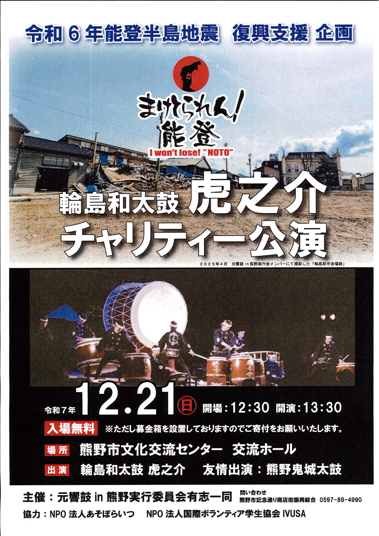 令和6年能登半島地震復興支援企画「輪島和太鼓虎之介チャリティー公演」が12月21日(日)午後1時半から、熊野市井戸町の市文化交流センターで開かれる。主催は元響鼓in熊野実行委員会有志一同、NPO法人あそぼらいつ・NPO法人国際ボランティア学生協会協力。