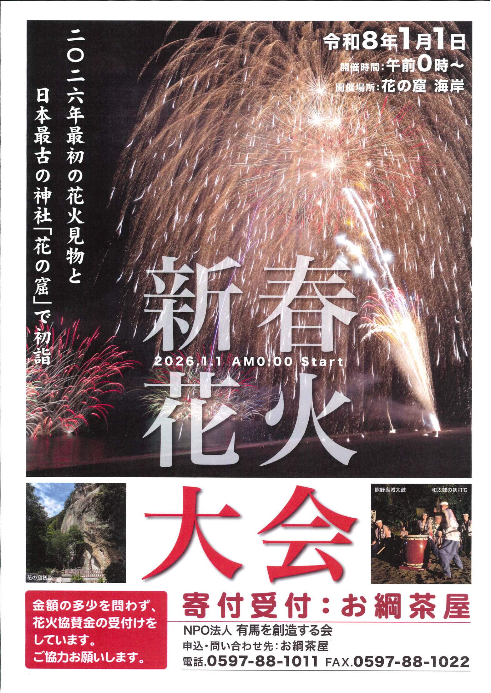 同会では「2026年最初の花火見物と日本最古の神社『花の窟』でぜひ、初詣を」と話している。