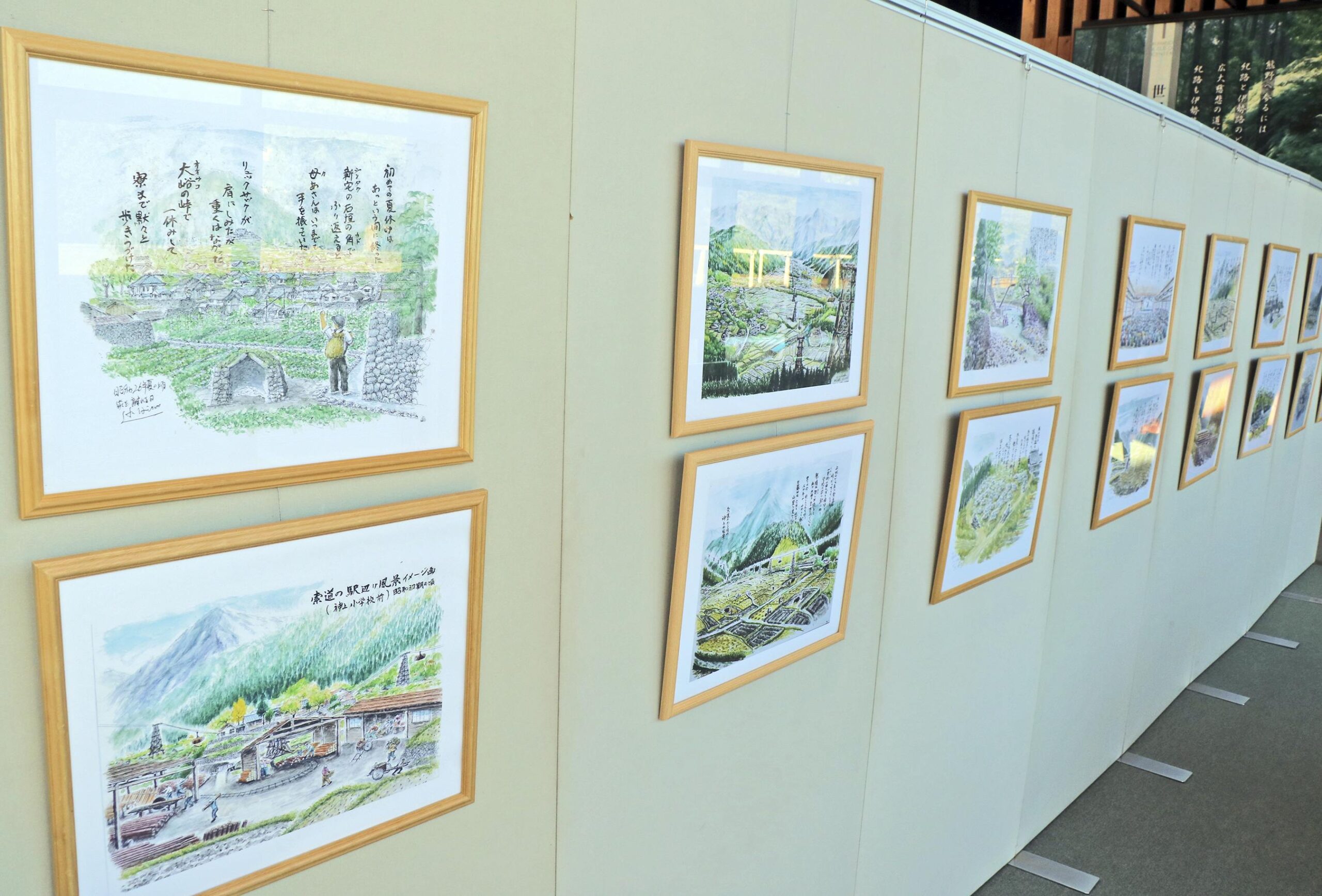 熊野市神川町出身の畑中弘生さん(91)が昭和20~30年代の郷里を描いた詩画作品展「ふるさとの詩が聞こえる詩画展」が6日から、尾鷲市の熊野古道センター展示棟ロビーで始まった。同展は1月18日(日)まで。