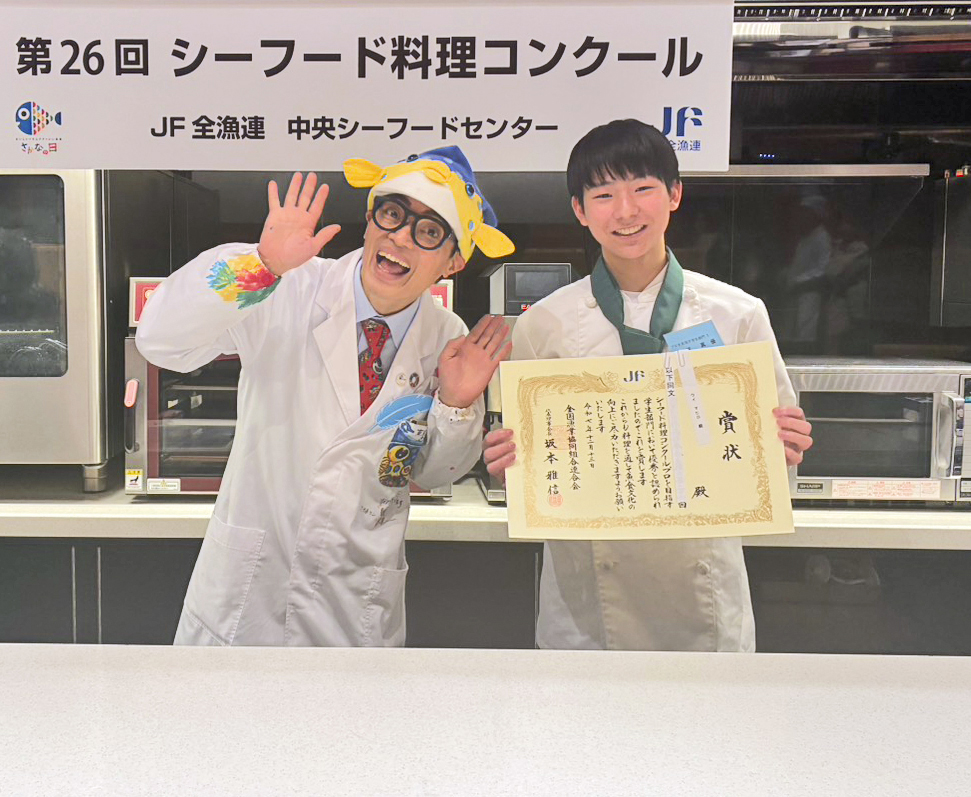 シーフード料理コンクールは、JF全漁連(全国漁業協同組合連合会)が主催。「魚活チャレンジ部門」に532点、「プロを目指す学生部門」に1188点、計1720点の応募が寄せられた。審査は服部栄養料理研究会会長の服部津貴子さんやタレントのさかなクンらが行い、アイデア性や普及性、調理手順、盛り付け、味などを総合的に評価。その結果、宇井君の作品が「プロを目指す学生部門」で全国漁業協同組合連合会会長賞に選ばれた。