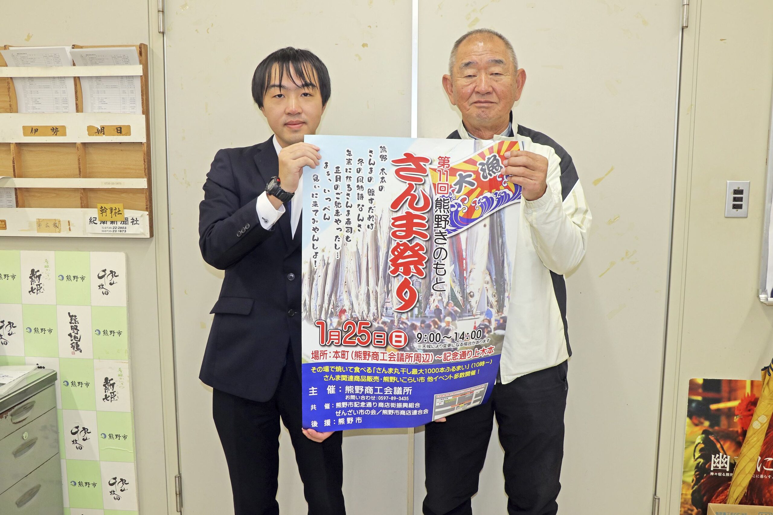 熊野商工会議所(榎本義秀会頭)は1月25日(日)午前9時から午後2時まで、熊野市木本町の記念通りと本町通りで「第11回熊野きのもとさんま祭り」を催す。熊野市記念通り商店街振興組合とぜんざい市の会、熊野市商店連合会が共催。24日、記念通り商店街振興組合の赤阪俊一理事長と熊野商議所の築地広一さんが記者会見しイベントをPRした。