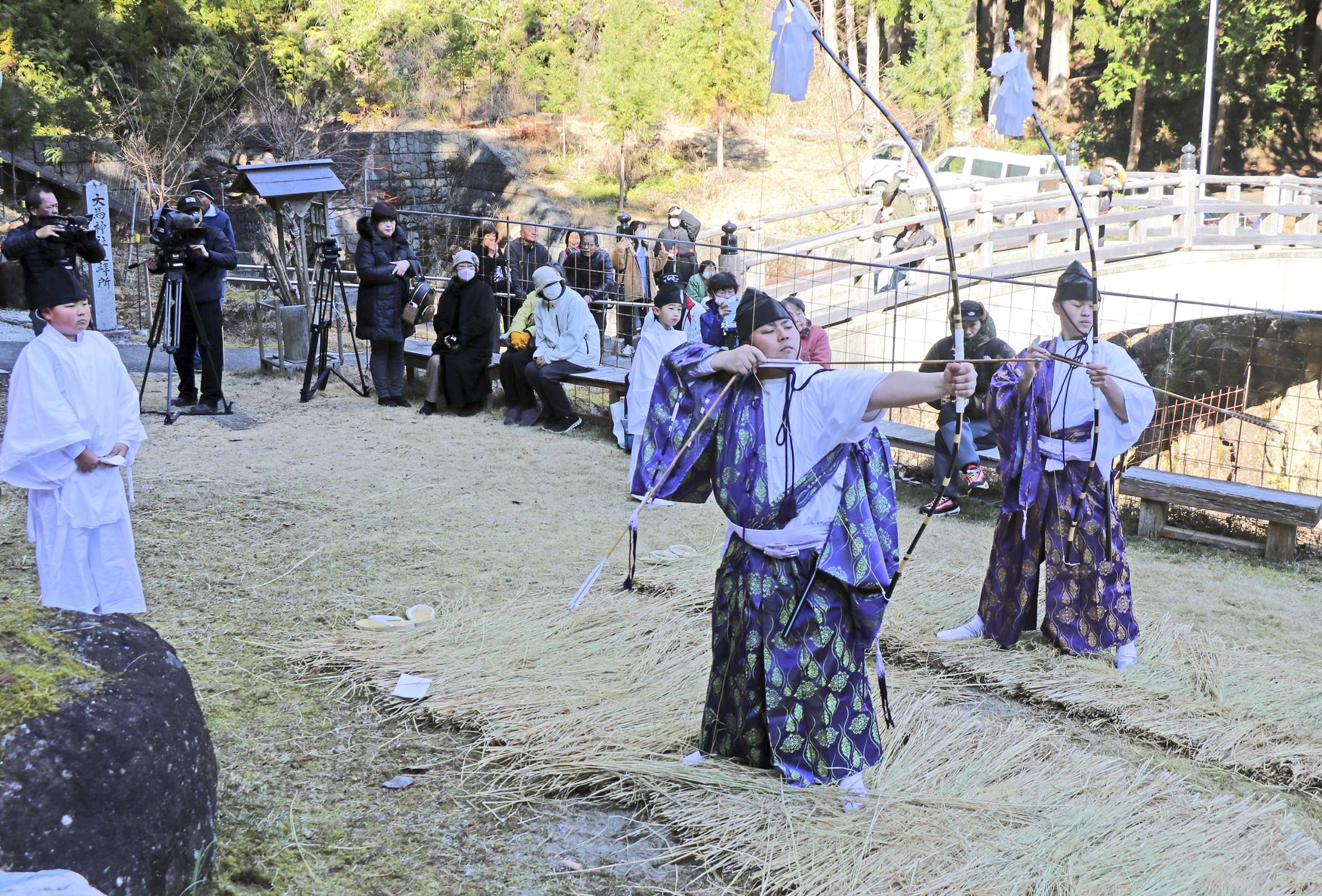 このあと、社務所下で弓引き神事が行われた。古代衣装に身を固めた2人が五穀豊穣などの願いを込め、約17㍍離れた的に向かって矢を放ち、今年は20本中4本が命中。見事的を射ぬくたびに参拝者から歓声が沸き起こり、残る4本は魔除けの遠矢として大空に向かって放たれた。三角田さんは「練習ほど上手くいかなかったが、当たって良かった。何事もなく過ごせるような1年になってほしい」とし、山口さんも「本番になって緊張しましたが、なんとか当てられてよかった。勉強やクラブ活動を頑張りたい」と笑顔を浮かべた。