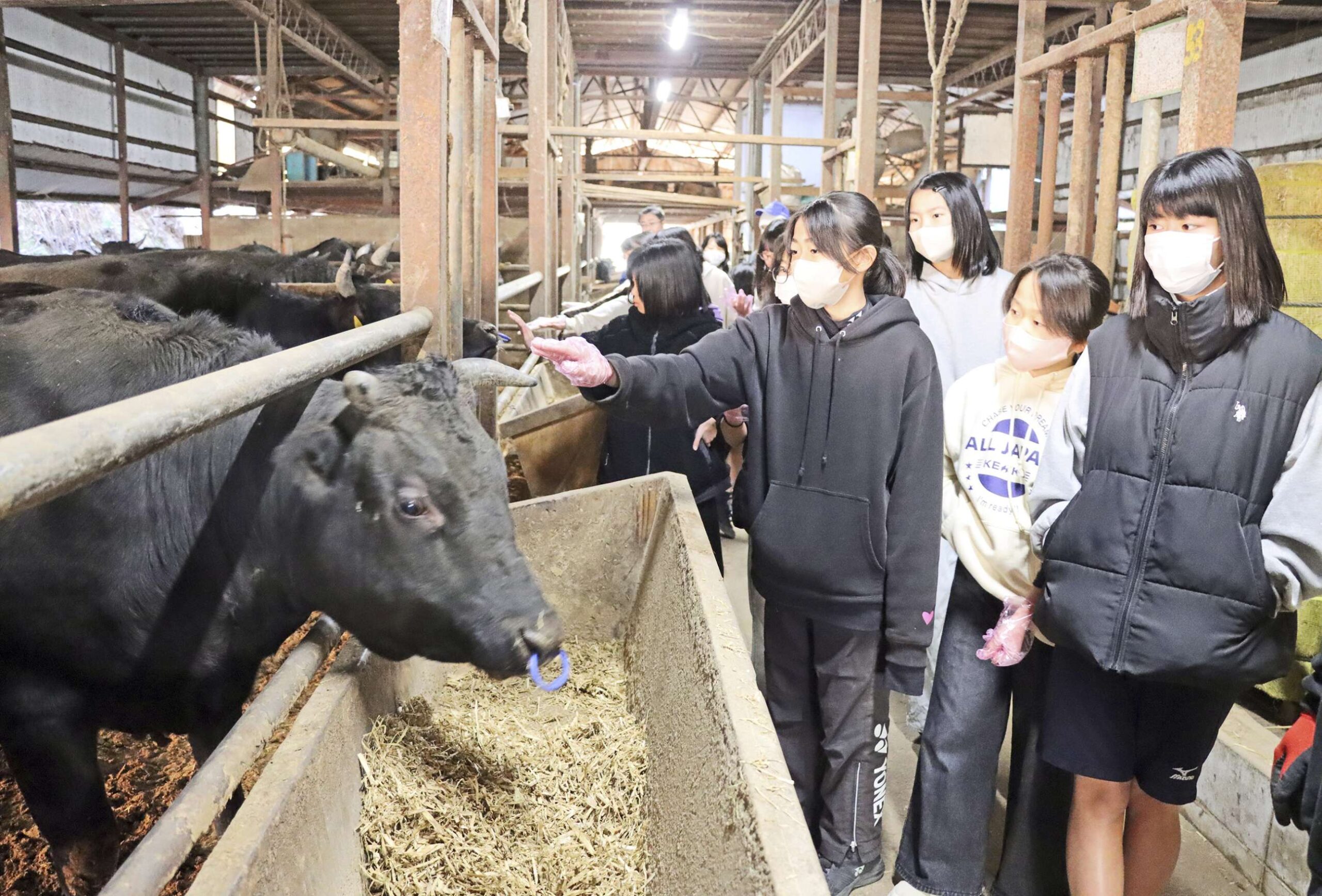 児童たちは西村社長や社員らから案内を受け、出荷を控えた大きな牛や成長過程の子牛などの厩舎を見学した。餌やりも体験させてもらい、興味津々。牛たちは人に懐いており、子どもたちの手をなめに来る場面もあった。牛の頭をなでた児童は「気持ちよかったのか、ずっとこっちについてきた」と笑顔を見せた。