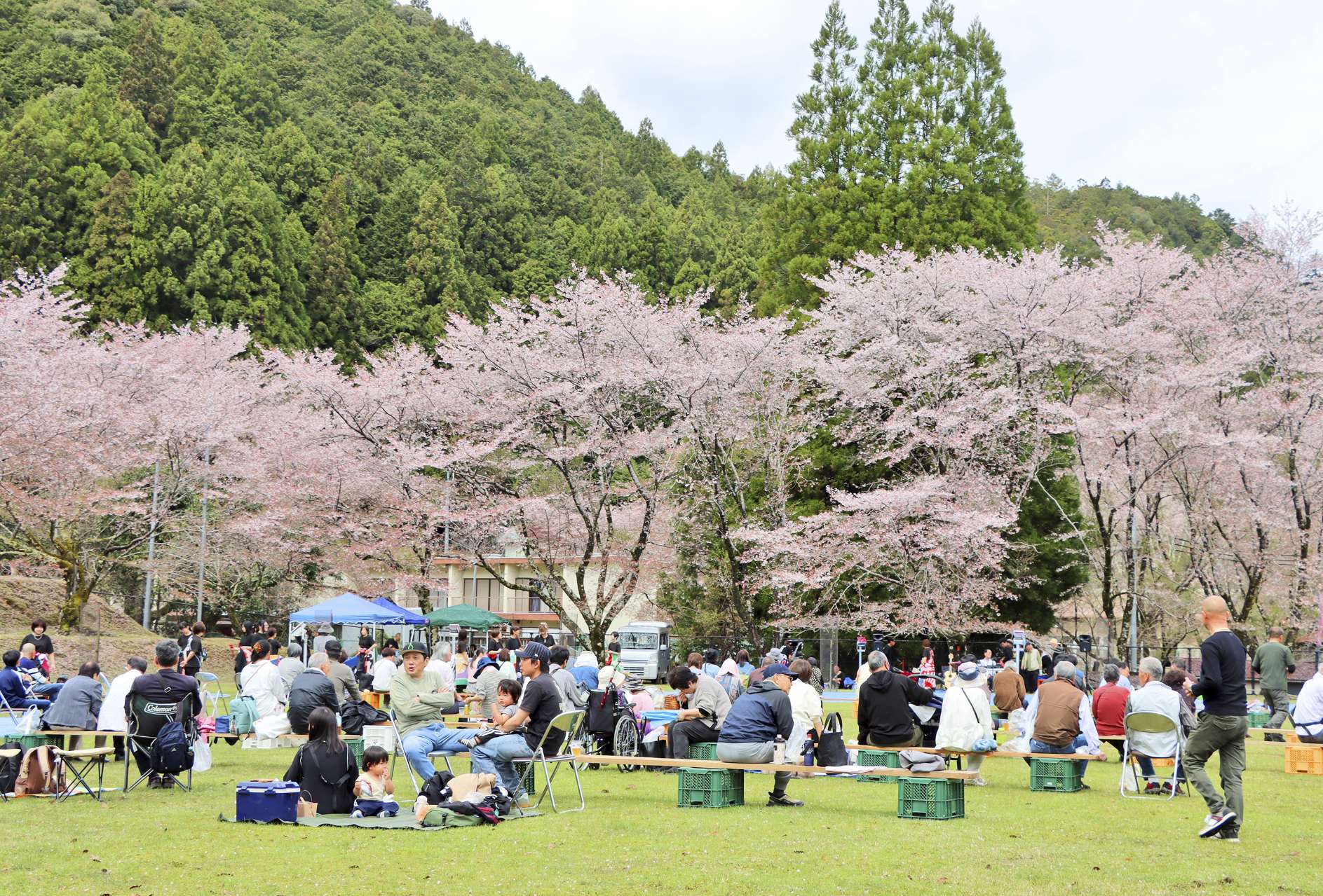 花見を楽しみに県内外から続々と家族連れらが訪れた。会場では地場産のよもぎ餅やジビエコロッケ、めはり寿司、茶粥など飲食コーナーをはじめハンドメイド品などの物販が行われた。花見客は買い物を楽しんだり、ピクニック気分で自前の弁当を広げたり楽しいひと時を過ごした。